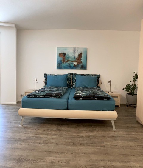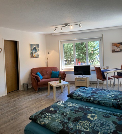 Nichtraucher Studio 35 m2 mit Parkettboden, Balkon süd/ost. Tisch & 2 Stühle. Offene Küche, gemütlicher Wohn-Schlafraum mit Esstisch, Sofa und Doppelbett, Schrank, Dusche/WC