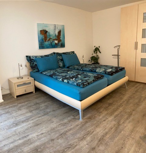 Nichtraucher Studio 35 m2 mit Parkettboden, Balkon süd/ost. Tisch & 2 Stühle. Offene Küche, gemütlicher Wohn-Schlafraum mit Esstisch, Sofa und Doppelbett, Schrank, Dusche/WC